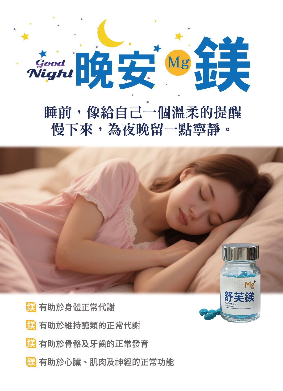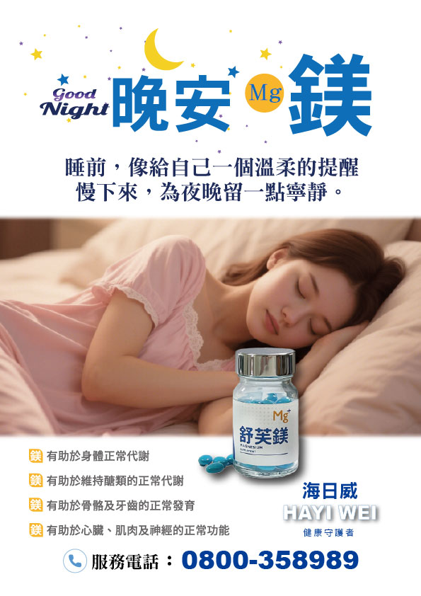 鎂與神經系統的平衡有關,參與體內多種神經傳導與荷爾蒙調節機制,例如調節神經興奮度、參與褪黑激素的合成。適量補充鎂有助於身體進入放鬆狀態,適合在睡前作為營養補給,支持穩定作息與夜間調節需求。